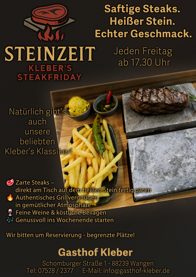 Jeden Freitag servieren wir Ihnen zarte Steaks, die Sie direkt am Tisch auf dem heißen Stein selbst garen. Ein einzigartiges Geschmackserlebnis – frisch, heiß und ganz nach Ihrem Geschmack.